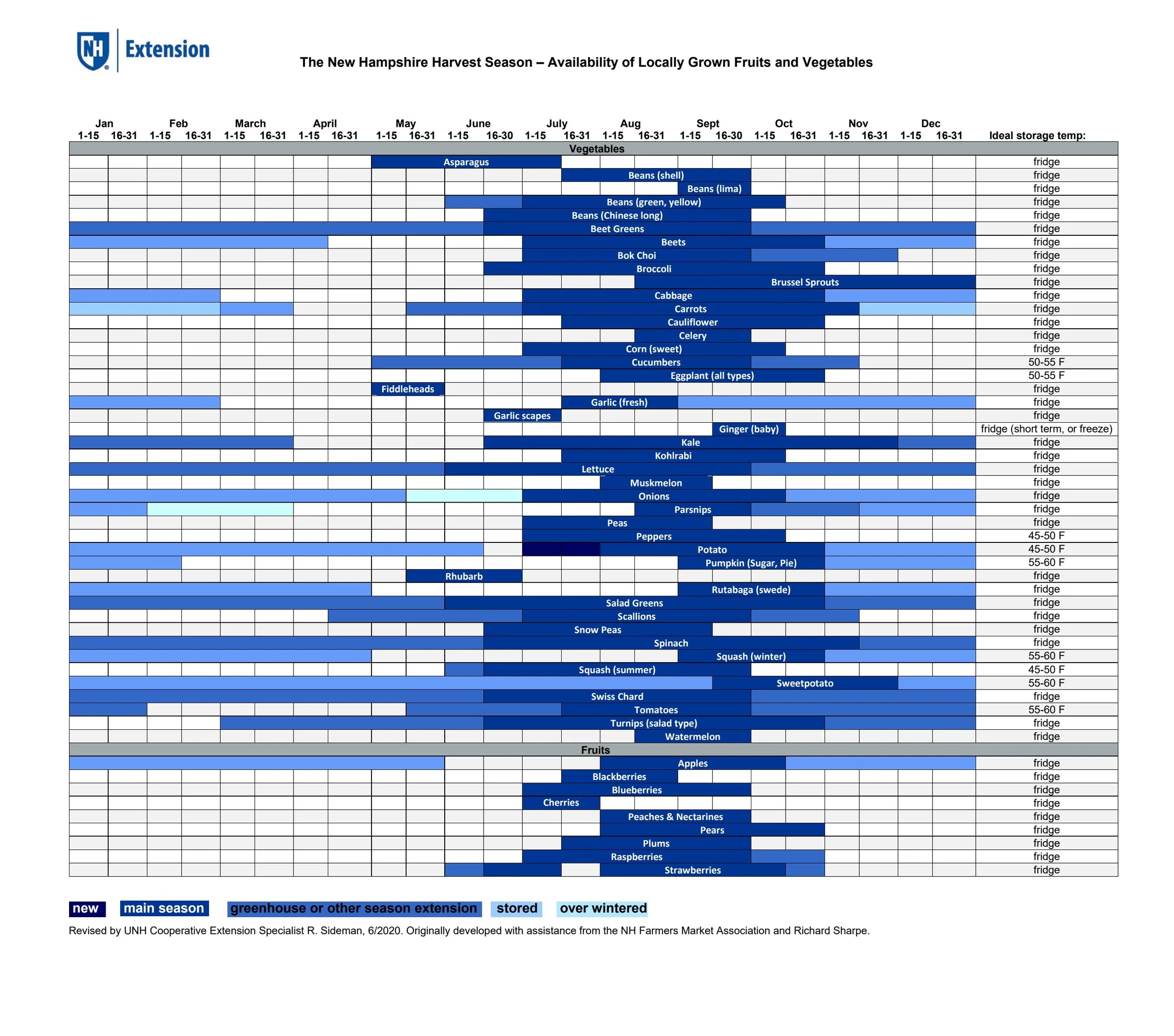 Our friends at UNH Extension have put together an extensive guide on when local NH fruits and vegetables are available. Please visit their website for more information on NH agriculture. Click Here